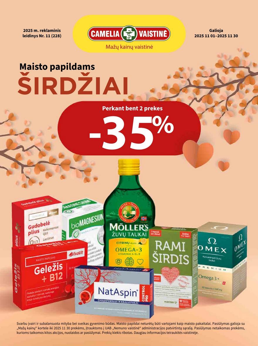 Camelia vaistinės leidinys Nr 11 ir kitos akcijos vienoje vietoje (galioja nuo 2025-11-01 iki 2025-11-30) Lapkričio mėnesio aktualijos Camelia vaistinėse. Naujas mėnesio pasiūlymų leidinys