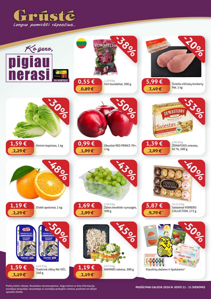 Grūstė akcijų leidinys ir kitos akcijos vienoje vietoje (galioja nuo 2026-03-21 iki 2026-03-31) Nuolaidos naujausiame pasiūlymų leidinyje nuo šio šeštadienio. Savaitinis prekybos tinklo Grūstė pasiūlymų leidinys jau čia.