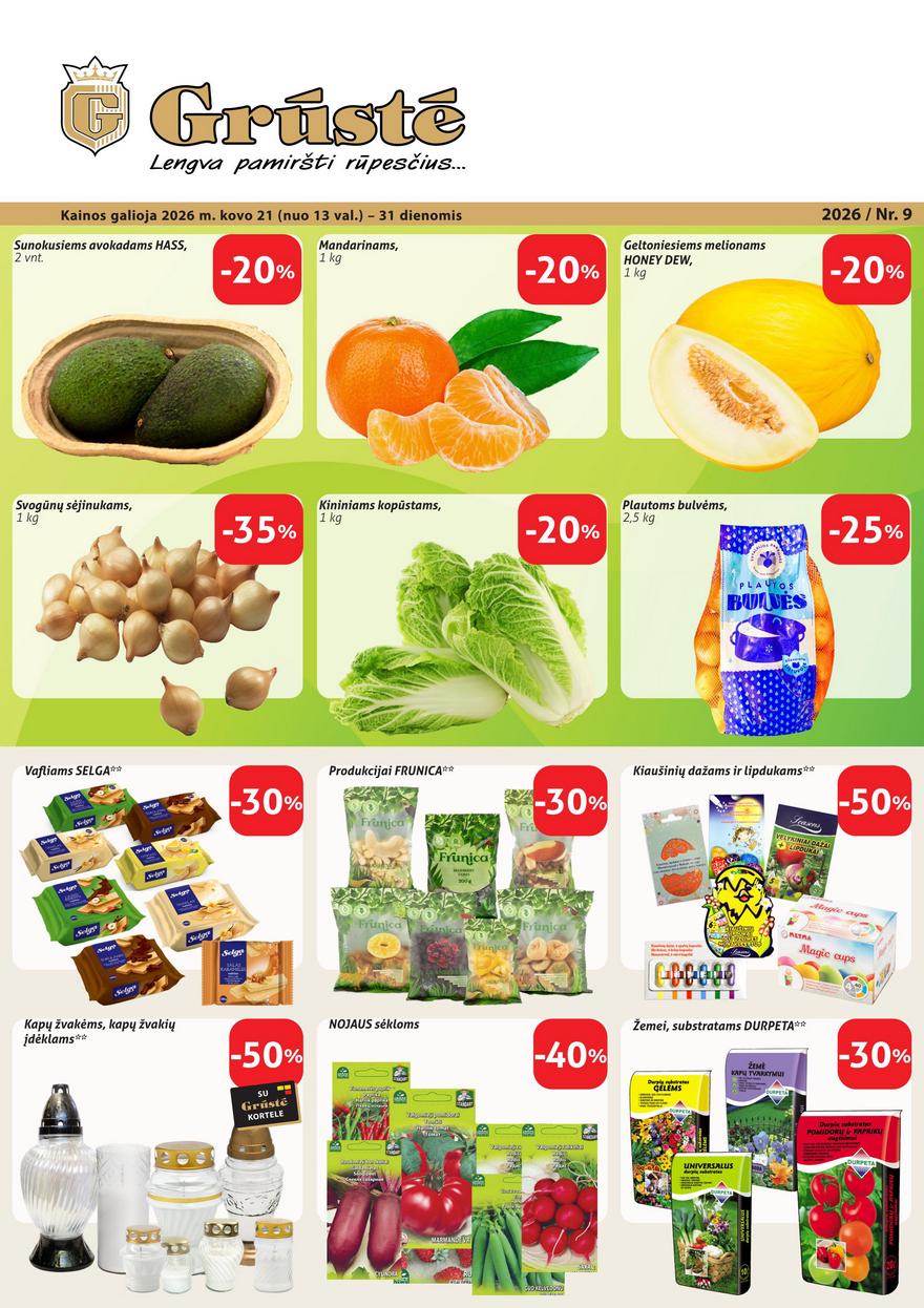 Grūstė leidinys ir kitos akcijos vienoje vietoje (galioja nuo 2026-03-21 iki 2026-03-31) Nuolaidos ir kainos parduotuvėse Grūstėje. Atnaujintas akcijų leidinys.