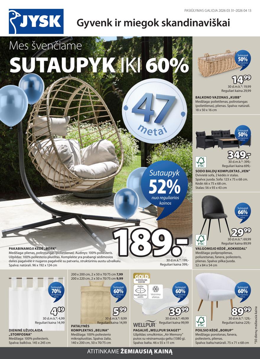 Jysk akcijų leidinys ir kitos akcijos vienoje vietoje (galioja nuo 2026-03-31 iki 2026-04-13) Nuolaidos naujausiame Jysk akcijų leidinyje. Atnaujinti savaitiniai pasiūlymai bei kainos.