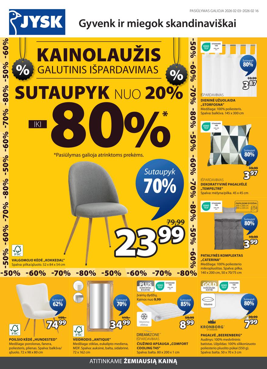 Jysk akcijų leidinys ir kitos akcijos vienoje vietoje (galioja nuo 2026-02-03 iki 2026-02-16) Nuolaidos ir kainos Jysk parduotuvėse. Atnaujinti savaitiniai pasiūlymai nuo antradienio.