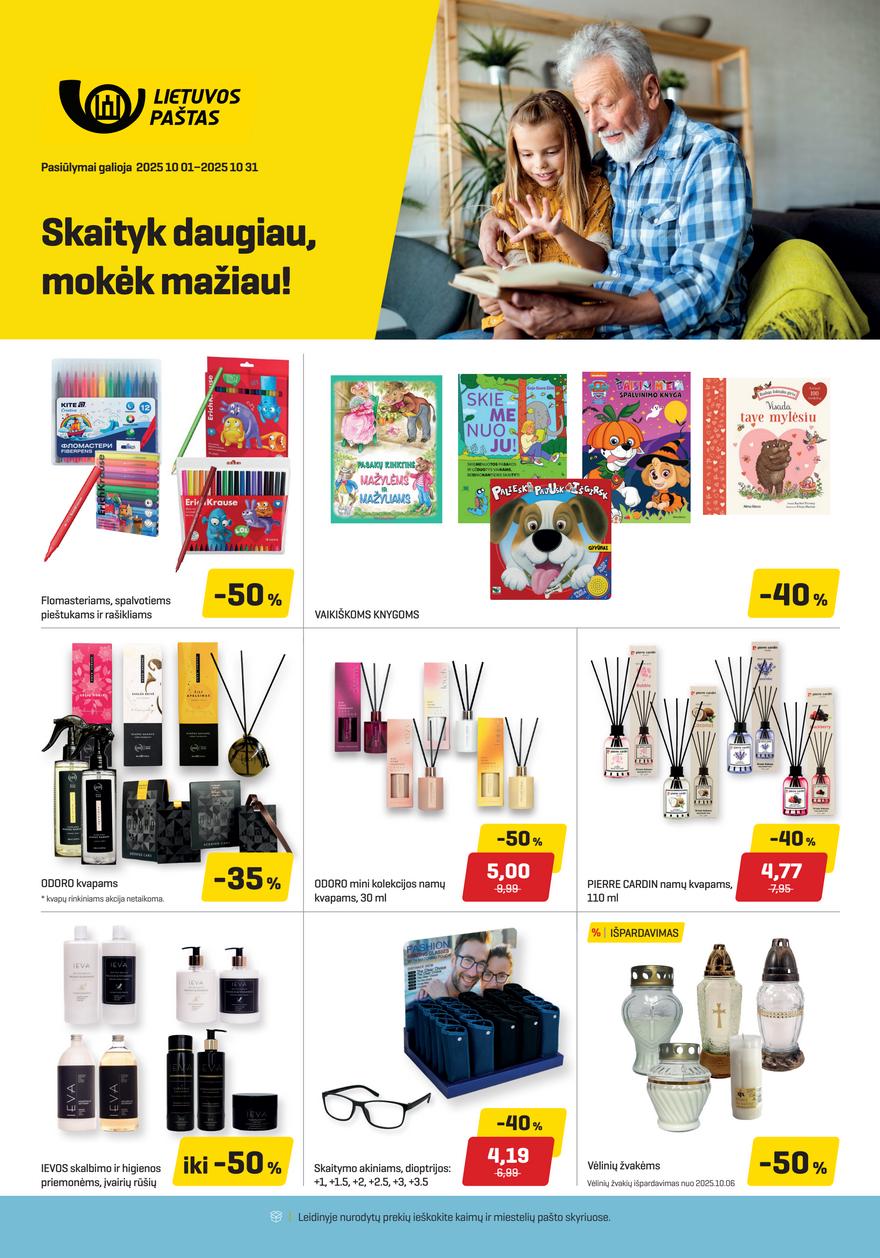 Lietuvos pašto leidinys ir kitos akcijos vienoje vietoje (galioja nuo 2025-10-01 iki 2025-10-31) Nuolaidos ir pasiūlymai Lietuvos pašto skyriuose spalio mėnesį. Naujas pasiūlymų ir kainų leidinys