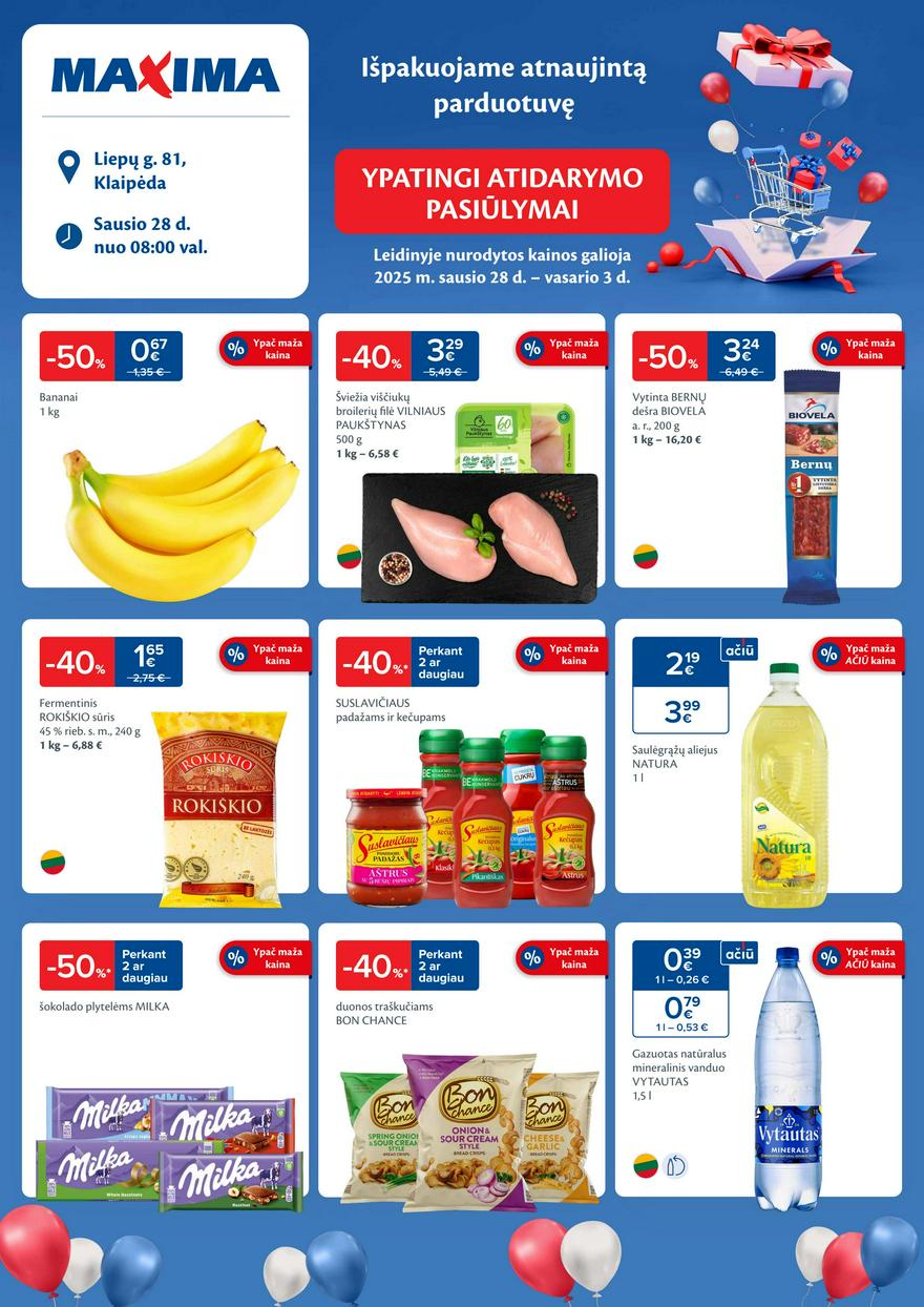 Maxima parduotuvė Klaipėdoje ir kitos akcijos vienoje vietoje (galioja nuo 2025-01-28 iki 2025-02-03) Atidaroma naujas prekybos tinklo Maxima parduotuvė Liepų g. 81. Atidarymo proga naujas pasiūlymų ir nuolaidų leidinys. Atidarymas vyks sausio 28 dieną aštuntą valandą ryto.