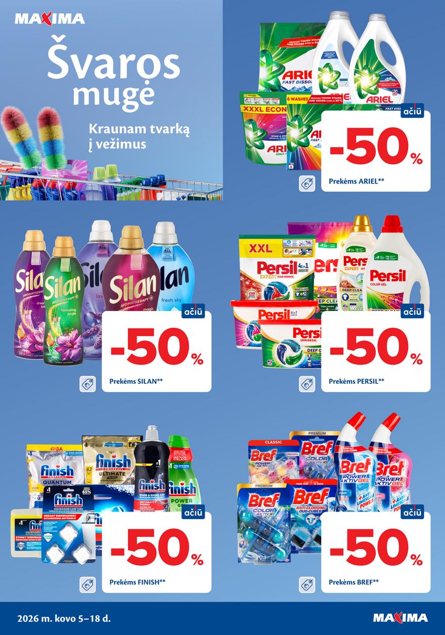 Maxima Švaros mugės leidinys ir kitos akcijos vienoje vietoje (galioja nuo 2026-03-05 iki 2026-03-18) Švaros prekių mugė Maxima parduotuvėse. Naujas nuolaidų leidinys ir specialūs pasiūlymai.