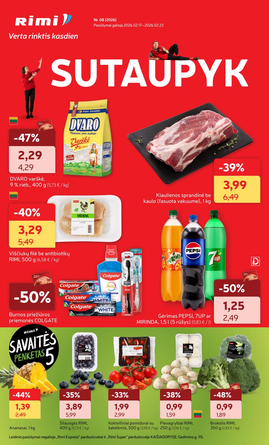 Naujausias Rimi leidinys Nr 8 ir kitos akcijos vienoje vietoje (galioja nuo 2026-02-17 iki 2026-02-23) Savaitės naujienos Rimi parduotuvėse. Susipažinkite su atnaujintais antradienio pasiūlymai naujausiame Rimi leidinyje.