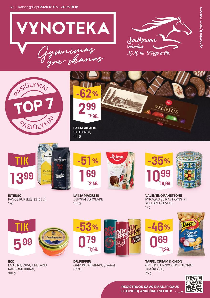 Vynoteka akcijų leidinys Nr 1 ir kitos akcijos vienoje vietoje (galioja nuo 2026-01-05 iki 2026-01-18) Naujas sausio mėnesio pasiūlymų ir nuolaidų leidinys apsiperkantiems parduotuvėse Vynoteka.